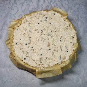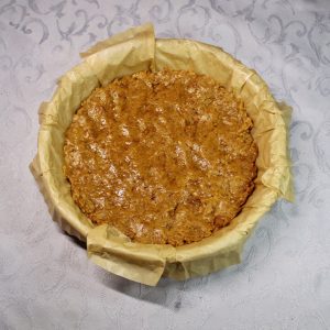 - Rivesti uno stampo (preferibilmente a cerniera) con carta forno e versa il composto. Pressa bene con il dorso di un cucchiaio per creare una base uniforme. Metti in frigorifero per almeno 30 minuti.