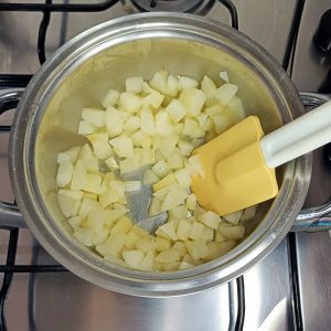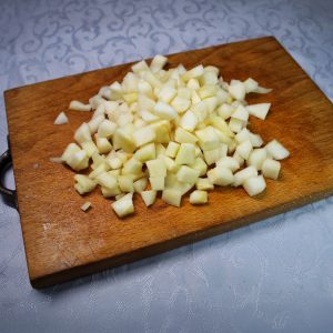 - Sbuccia le pere e tagliale a cubetti piccoli e regolari.