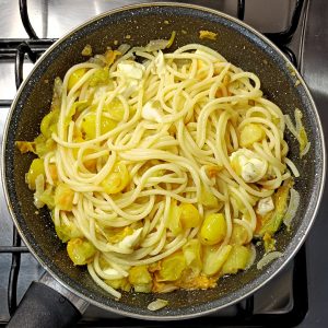 - Scola la pasta al dente (conservando un mestolo di acqua di cottura) e saltala direttamente nella padella con il condimento;