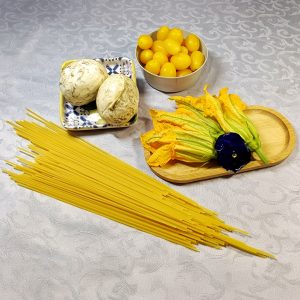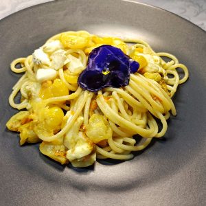 Spaghetti con datterini gialli, fiori di zucca e mozzarella di bufala affumicata
