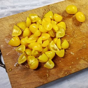 - Lava i pomodorini datterini gialli e tagliali in quattro parti;