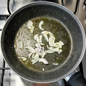 - In una padella capiente, scalda un giro d’olio EVO e fai appassire lo scalogno affettato finemente;