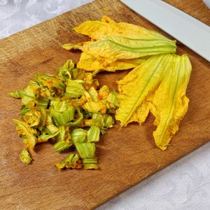 - Pulisci i fiori di zucca: rimuovi il pistillo interno e il gambo, poi tagliali a striscioline grossolane;