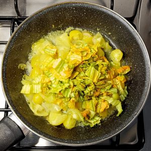 - A metà cottura dei pomodorini, aggiungi i fiori di zucca in padella. Cuociono in un attimo, quindi bastano 2-3 minuti affinché si ammorbidiscano senza sparire del tutto;
