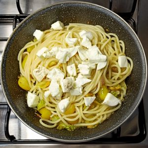 - Mescola velocemente affinché la mozzarella inizi appena a filare senza sciogliersi completamente. Se serve, aggiungi un goccio d’acqua di cottura per mantenere il tutto cremoso;