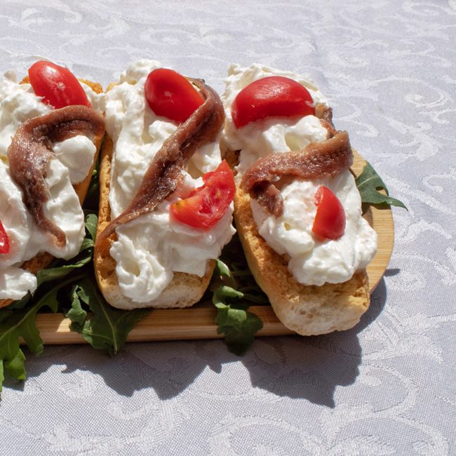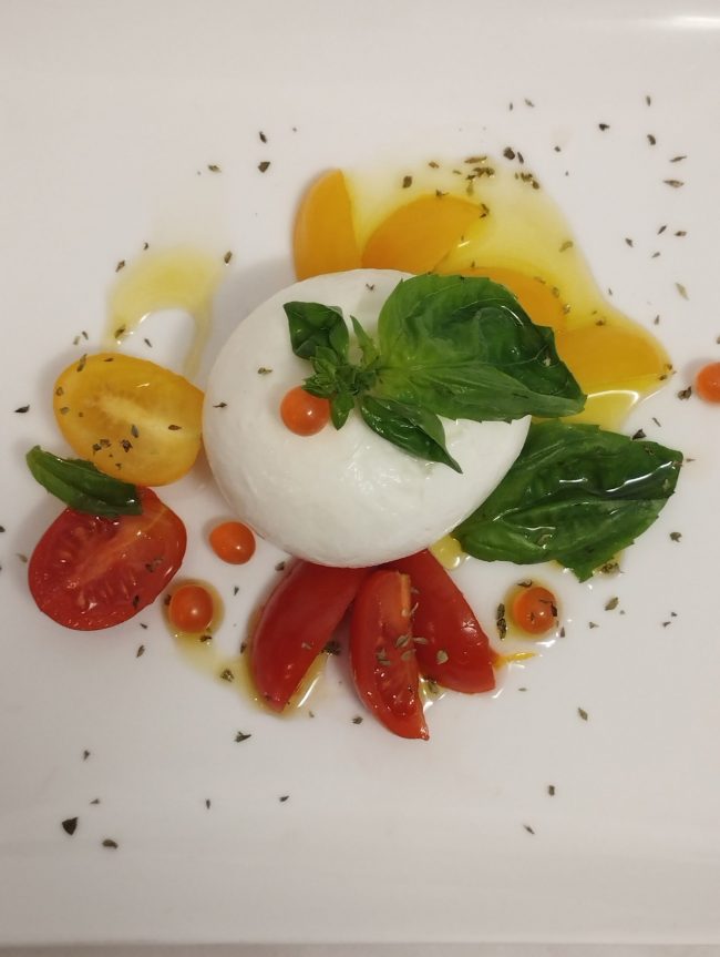 Burrata con un mix di pomodori gialli e rossi, un filo d’olio extravergine, sale, origano e basilico.