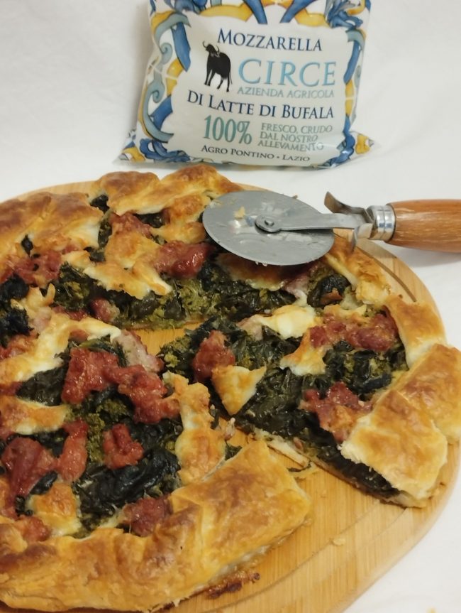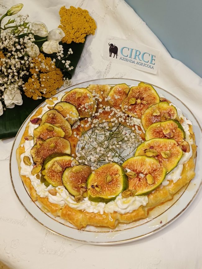 una corona di pasta sfoglia croccante, farcita con una crema di ricotta, burrata, pepe nero, zeste di limone e un pizzico di sale.