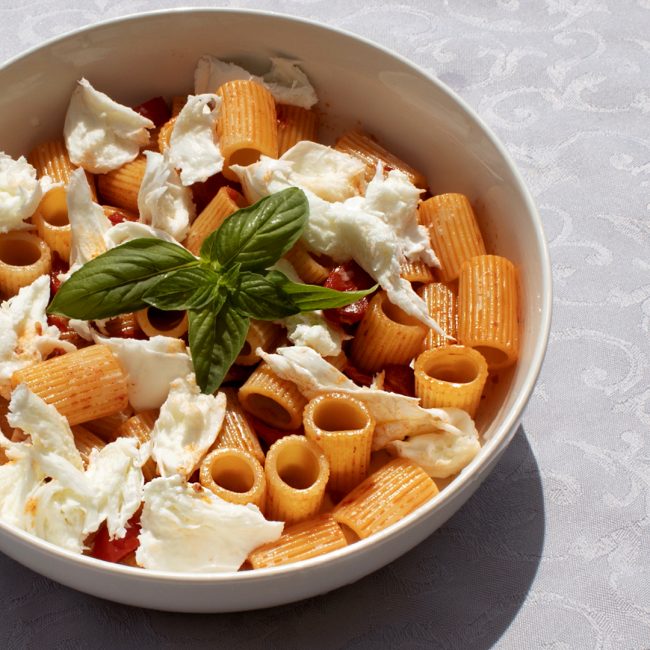 Pasta con pomodorini e mozzarella di bufala e basilico